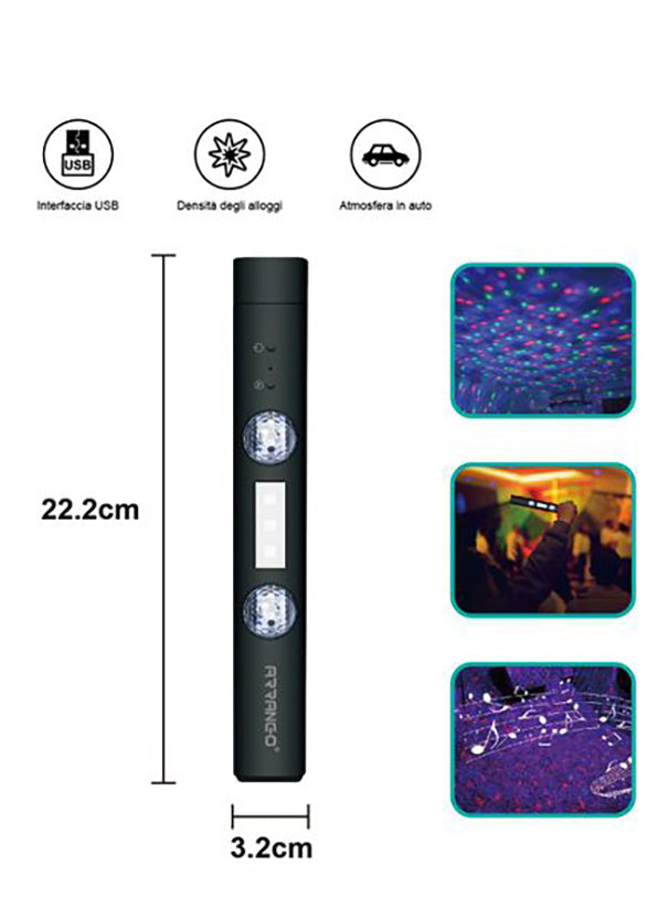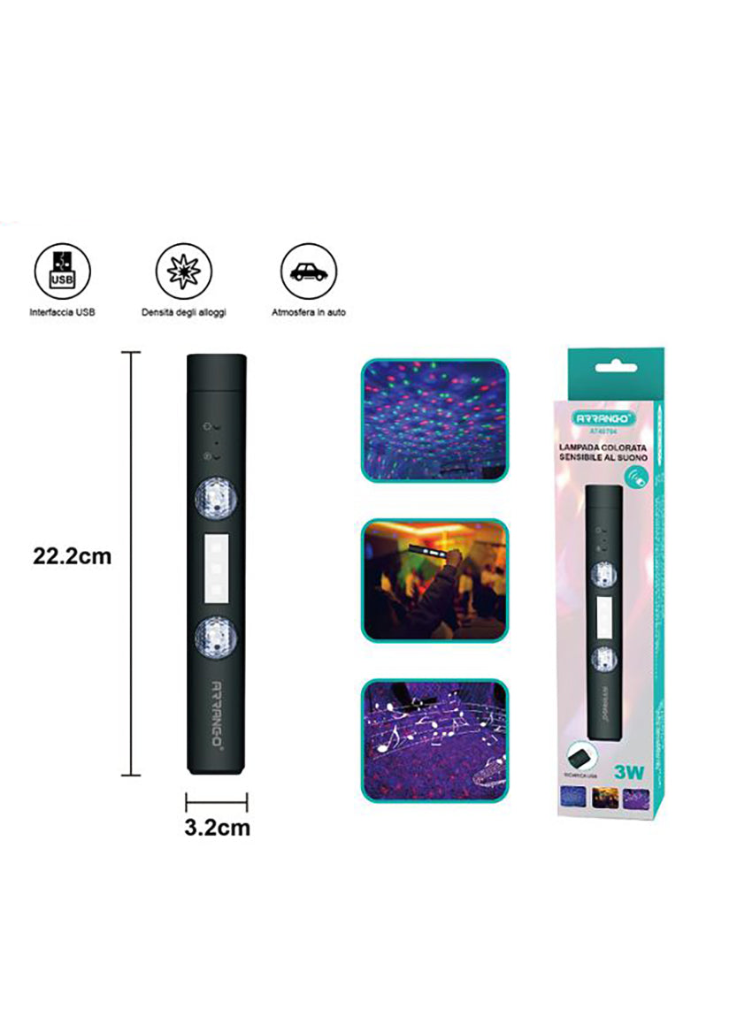 Lampada LED dal design compatto, con luce RGB e funzione sensibile al suono, ideale per creare atmosfera in qualsiasi ambiente.