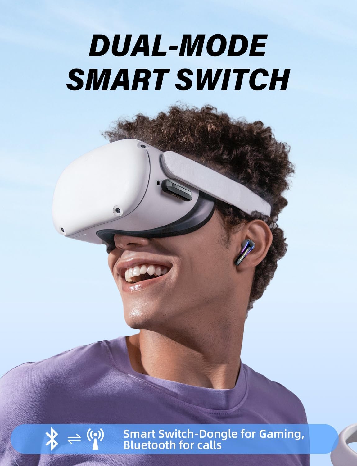 2.4G 无线游戏耳机,配备 ENC 麦克风,20ms 低延迟。完美适配 PS5/4、Meta Quest 3/3S/2。2.4GHz 双模蓝牙,轻松连接您的设备。适用于智能手机、平板电脑、笔记本电脑、Steam 平台、Switch、PC 和 VR。