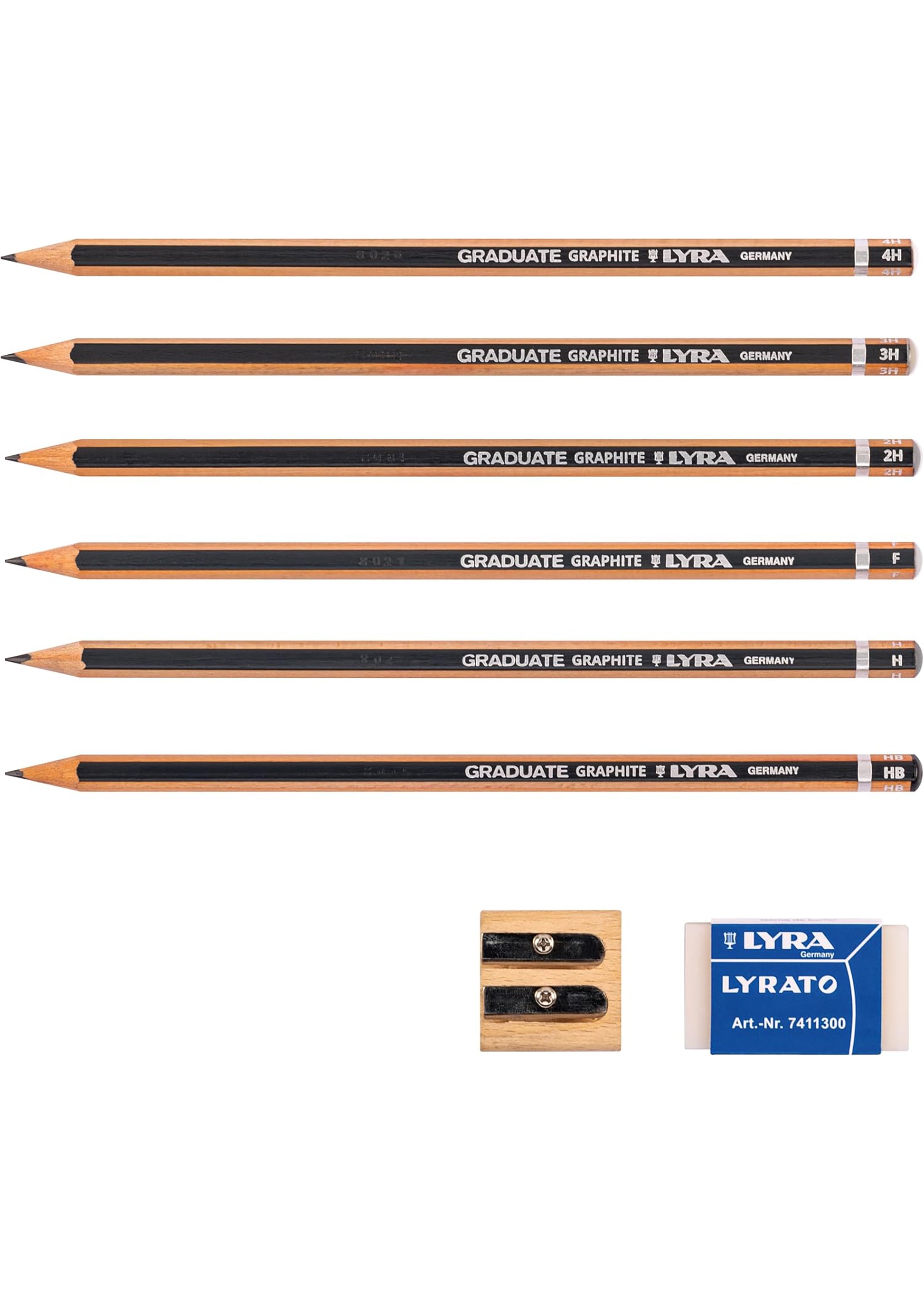 包装内含 1 支不同硬度的铅笔(4H C 3H C 2H HCFC HB)、1 个双孔木制铅笔刀和 1 个 Lyrato 橡皮擦。