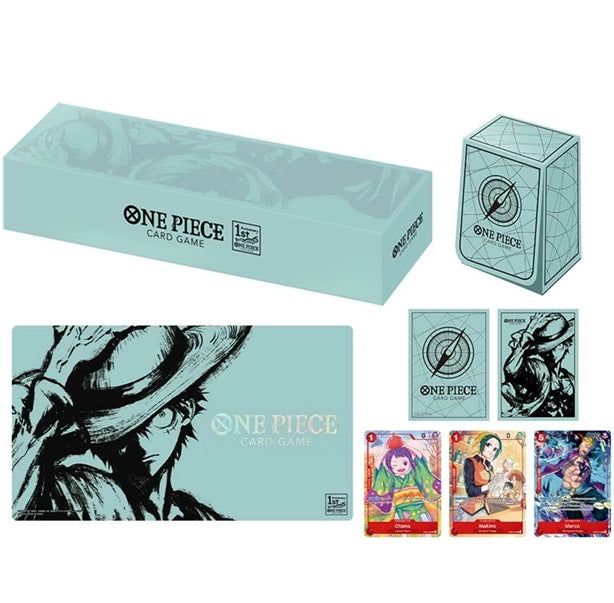 海贼王卡牌游戏高级套装,庆祝日版发行一周年。套装包含全新插画的卡牌及其他专属设计的配件。卡牌文字为英文。包含: